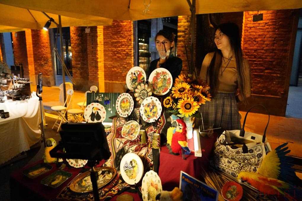 两名女孩在景德镇陶溪川春秋大集上销售创意瓷器(2023年10月17日摄)。新华社记者 周密 摄