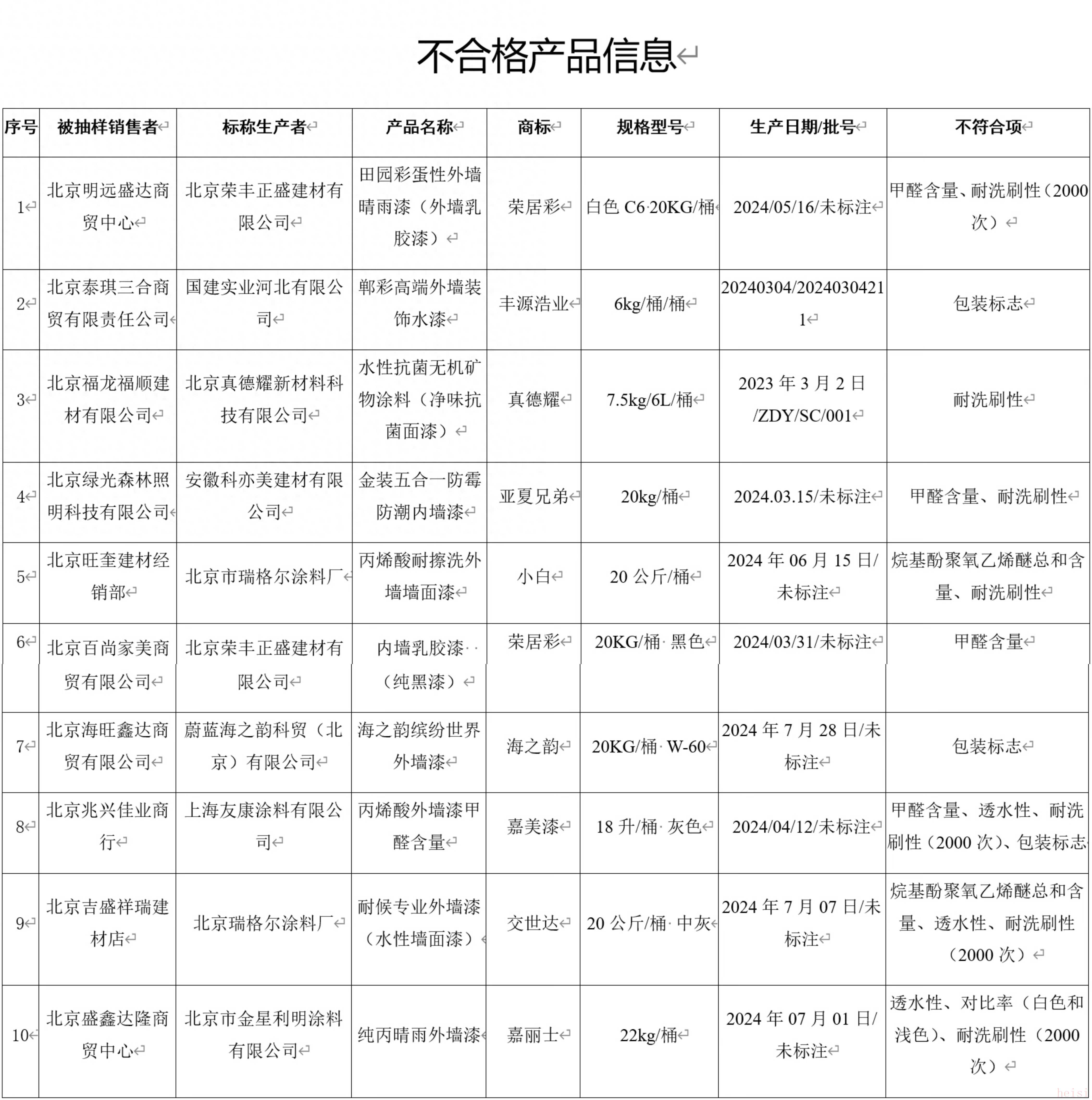 不合格名单显示,标称北京荣丰正盛建材有限公司生产的“荣居彩”牌田园彩蛋性外墙晴雨漆(外墙乳胶漆)(规格型号白色C6 20KG/桶;生产日期/批号2024/05/16/未标注),甲醛含量、耐洗刷性(2000次)不合格;标称上海友康涂料有限公司生产的“嘉美漆”牌丙烯酸外墙漆甲醛含量(规格型号18升/桶 灰色;生产日期/批号2024/04/12/未标注),甲醛含量、透水性、耐洗刷性(2000次)、包装标志不合格;标称北京市金星利明涂料有限公司生产的“嘉丽士”牌纯丙晴雨外墙漆(规格型号22kg/桶;生产日期/批号2024年07月01日/未标注),透水性、对比率(白色和浅色)、耐洗刷性(2000次)不合格。