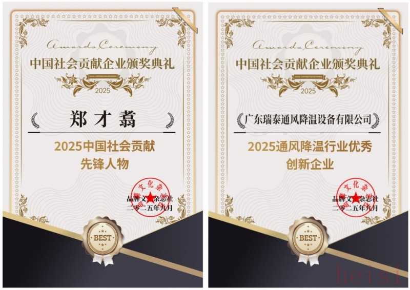 广东瑞泰通风降温设备有限公司凭借卓越成就,成功斩获“2025通风降温行业优秀创新企业”奖项;其掌舵人郑才翥董事长,因植根行业二十余年的深厚积淀与杰出贡献,荣膺“2025中国社会贡献先锋人物”大奖。