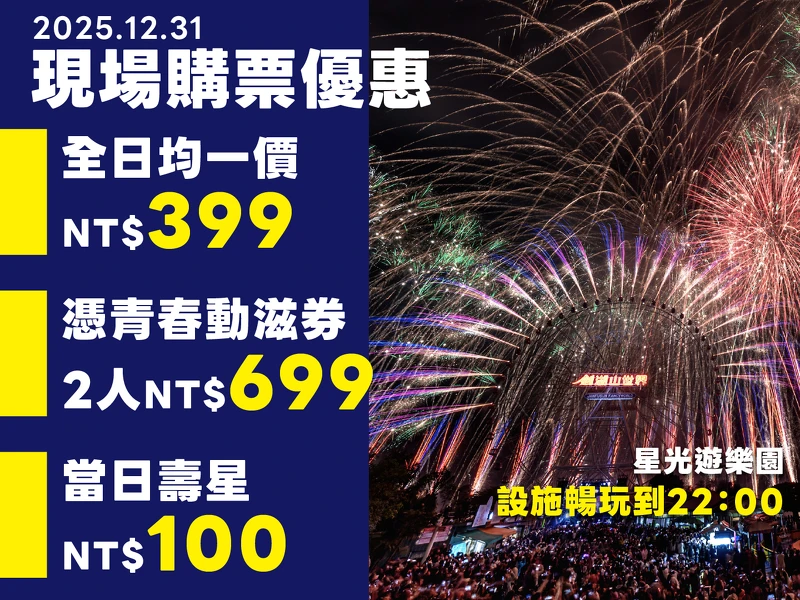 12/31跨年当天,游乐设施一路延长开放至晚间10点,游客能从早玩到晚、享受超过14小时的狂欢!当天也推出全日票399元优惠 (原价1199元)、凭青春动滋券购票两人同行699元、当日寿星本人凭证购票,更能享有超值优惠价100元。