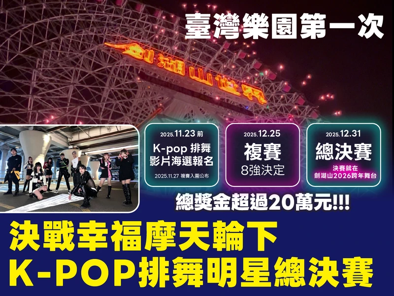 剑湖山今年更举办台湾乐园史上首次,吸引近40支队伍报名,经过多关筛选,複赛将于12/25登场,而总决赛定于12/31跨年夜在主舞台举行。在万人见证下,各路舞者们将在摩天轮前争夺超过20万元总奖金,热血程度破表。