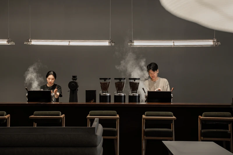 水湳门市由不醒人室内装修操刀,以方格地砖建立理性秩序,长型吧檯结合外露管线与沉稳木作,形塑上轻下重的视觉比例。森林绿绒面吧檯椅与抱枕柔化金属家具的线条感,灯光选用台湾设计品牌柒木的纸灯笼吊灯,温润光线让人一坐下来便自然放慢节奏和心情。大面积玻璃引入砾石小径与绿意景观,形成室内外相互呼应的都市绿洲。空间透过分区与色彩语彙,让Phase Coffee的沉稳基调中,自然融入DUM DUM的活泼元素。木质、灰色混凝土与橘绿亮色系在同一场域中取得平衡,空间本身成为双品牌共创的一部分。