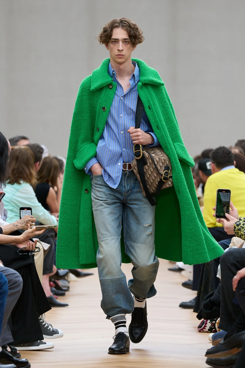 刚刚落幕的Dior 2026秋冬男装大秀上,从开场的亮片背心搭配窄管牛仔裤,西装外罩的刺绣印花丝质大衣、皮草内衬的连帽工装大衣、皮草装饰袖口和丝绸长罩衫,都和来自Bar Jacket转化的剪裁精緻西装,相衬出前所未见的轮廓――Jonathan Anderson出乎意料地以为主题,取材一百年前的高订大师Paul Poiret的archive和Dior先生剪裁相互混融再创新,从来没有一个时装屋的承继者取材其他时装屋为灵感,Jonathan这个创举似乎暗示着即将登场的高级订製服大秀的可能走向,而身为Dior首个男、女装与高订创意总监,Jonathan Anderson的企图也并不只是延续Dior经典而已。