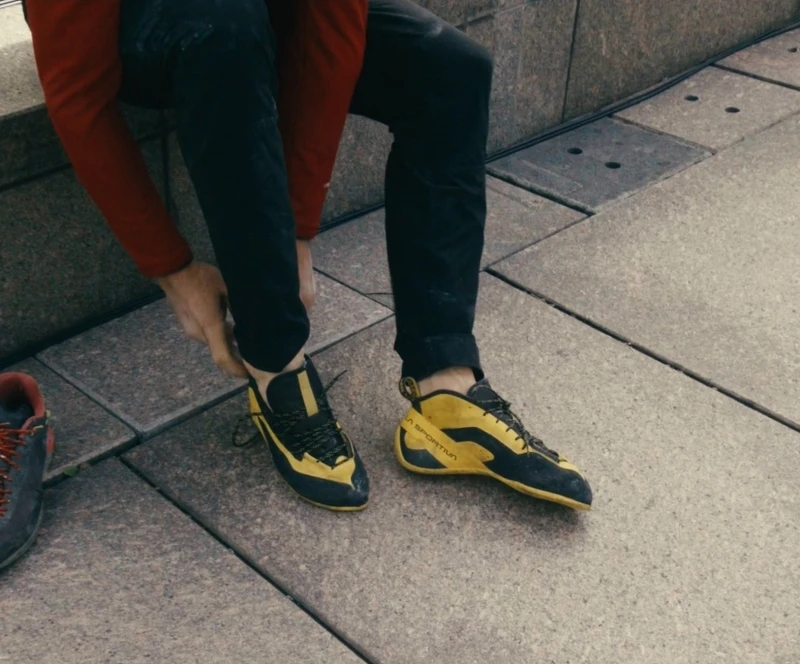 比起服装,Honnold脚上的攀岩鞋也是成就这次挑战不可或缺的装备之一,他此次选择的是来自义大利专业攀岩品牌La Sportiva的超薄底攀岩鞋款,从画面中就可以看出,鞋身极度贴合脚掌、鞋底厚度被压到最薄,几乎没有任何多余结构。