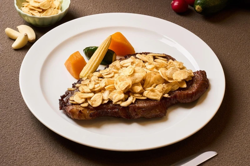招牌以10oz肉量直接对决肉食控的胃,铺满金黄酥炸蒜片毫不手软。蒜片每日小火慢炸、定时换油,香而不苦,与牛排油脂形成强烈对比,是一上桌就能理解品牌风格的代表作,无蒜不欢的小编最喜欢的就是这一道,酥脆又不苦的蒜片当零食吃也超级涮嘴。