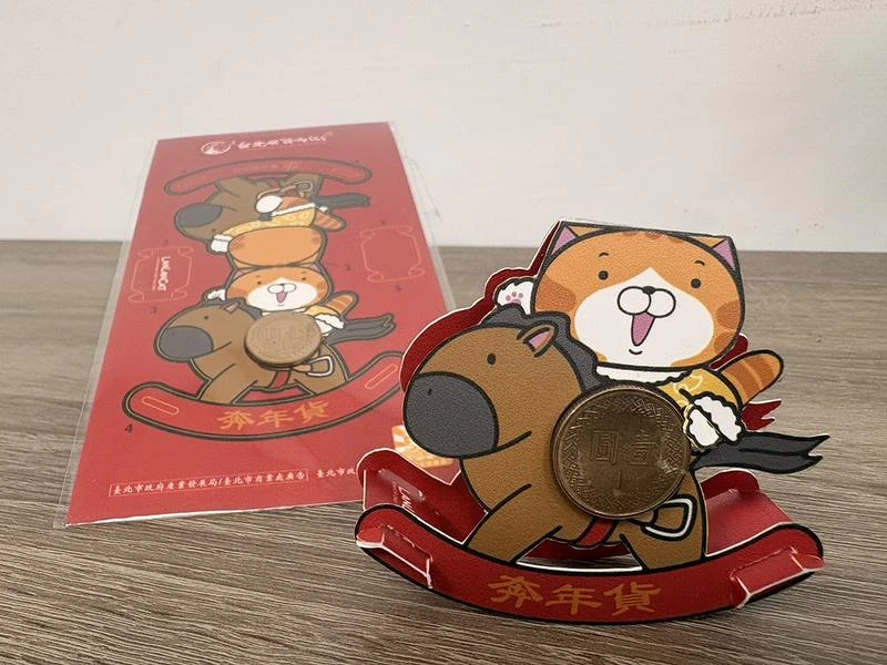 想讨吉利的人,可得锁定限定招财神物!手持一元硬币的白烂猫骑上摇摇马,可透过透过参与永乐广场互动游戏、首长走街拜年活动获得。