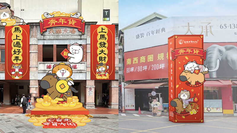 今年年货大街充满可爱元素,迪化街商圈会看到、等特色迎宾牌楼及巨偶;永乐广场地面则有5米高气偶,更装饰着象徵财富的金元宝传递吉祥意涵。永乐市场外墙及屋顶还能看到家族成员及气偶,另外也有巨型春联、可骑乘的亲子组摇摇木马,为传统街区增添拍照打卡点。现场提供套圈圈、收集、传统年艺体验,洋溢着满满节庆氛围。