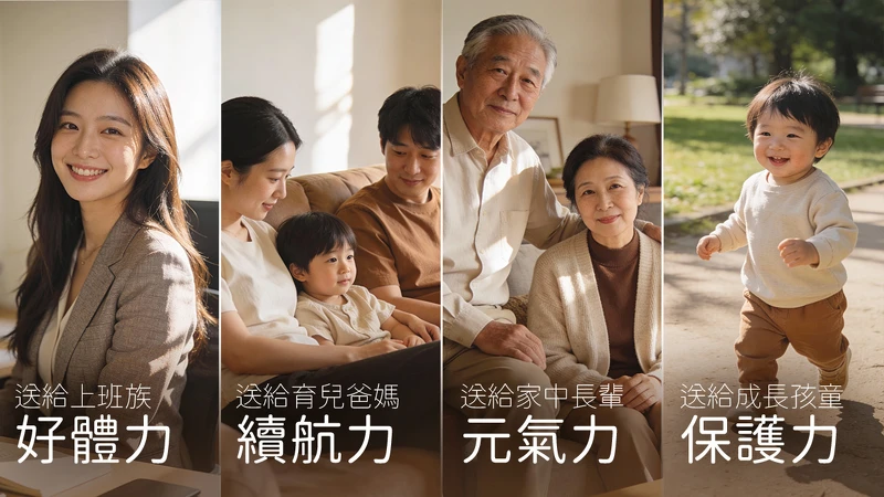 过年送礼,其实是替生活里重要的人,多着想一点点。让每天忙碌奔波的上班族补充;为白天上班、晚上育儿的爸爸妈妈提升;也替年纪渐长的长辈守住精神好的;更支持跑跑跳跳的孩子一份!