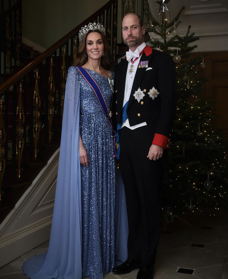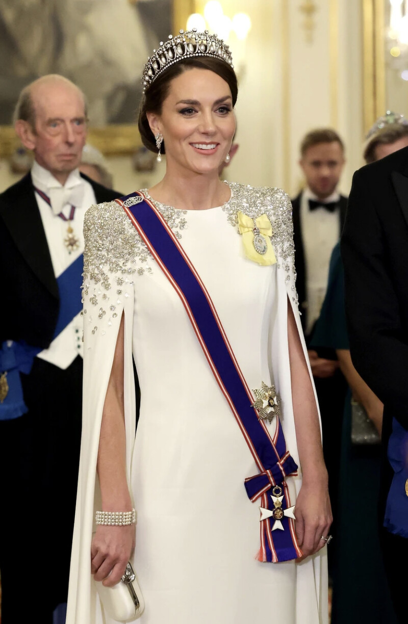 凯特王妃以一袭Jenny Packham的亮片斗篷礼服,和她首次选择配戴的东方圆环式冠冕,出席2025年12月举办的德国国宴。IG@princeandprincessofwales