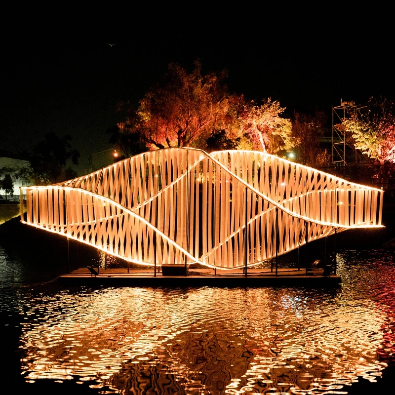 透过光的流动开启了通道的入口,一座四股螺旋的光之通道横亘于河道之间,侧看如一座连接两地的桥体。观众以视觉穿越其中,彷彿走入时空缝隙。光与雾在结构间交织,空间在视角转换中扭转。