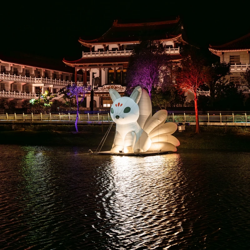 白狐静静伫立于雾气与光影之间,九条尾巴如羽翼般展开,闪耀着微微的光。牠既是守护神,也是能量的化身,穿越云端降临人间,守望着流光溢彩的月津港。作品以气膜结构塑造柔软而发光的身体,展现灵性与科技的共生。