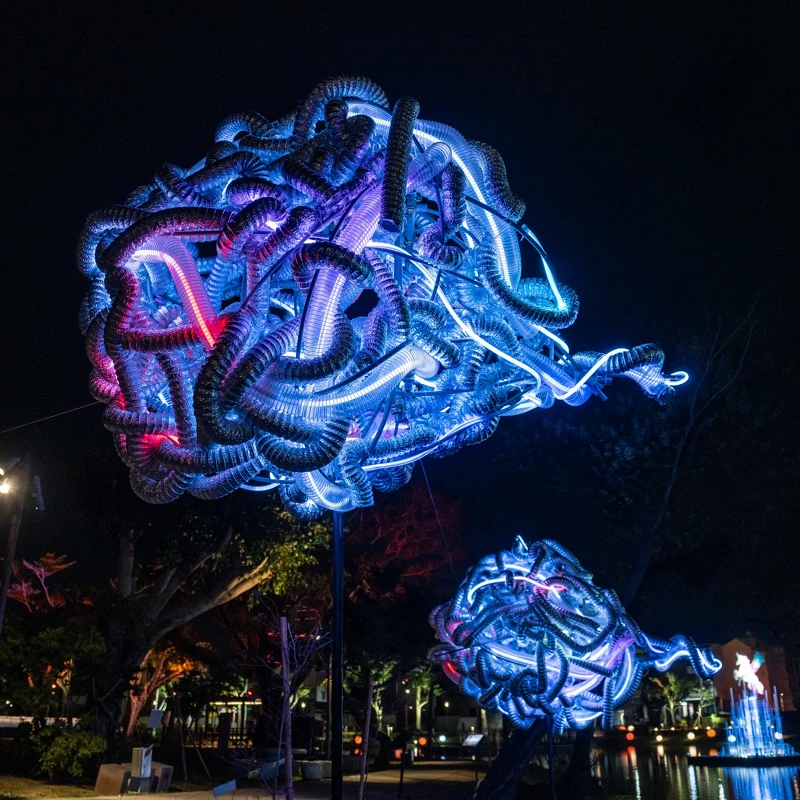 今年集结台湾、日本、韩国等地艺术家参与创作,展出多达60组作品,并规划、、三大展区布展,把整座月津港河域转变为一座漂浮于时空与想像之间的光艺术场域。撷取盐水数百年来累积的信仰文化、自然景观,透过光、雾、声音及互动装置,开启多元而开放的未来想像。
