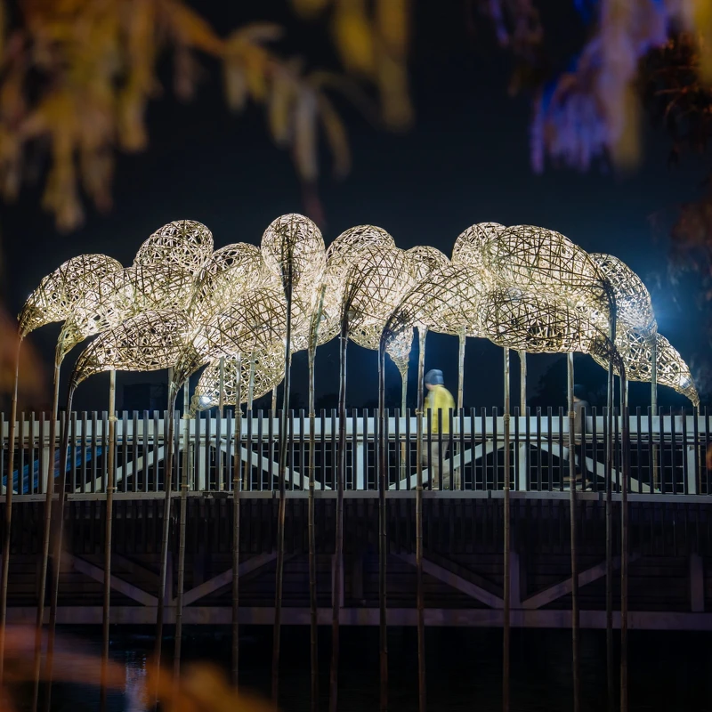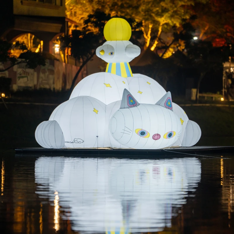 一头来自云端的神兽,静静驻留于水面之上。半透明的和纸光体散发柔亮光晕,彷彿梦想在夜色中缓缓成形。牠的独角象徵理想与科技的交融,翅翼如云层般开展,映照在河面,形成上下两个时空的镜像。