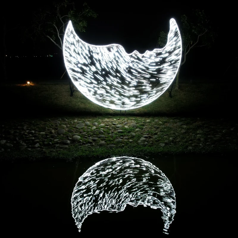在流动的光线之中,时间正缓缓流动。作品以弧形的金属结构与LED光带组成,看似凝结于某个瞬间,却在细微的闪烁中持续变化。月的形体在水面倒映,映出孩童的轮廓与对视的剪影,象徵未被言说的未来与记忆的回声。