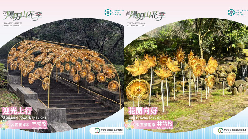 今年特别邀请装置艺术家林靖格ChingKe Lin,以茶花、樱花、向日葵为印象创作两件装置艺术《迎光上行》、《花开向好》,以竹编造型打造拱廊步道及点缀山林,以回应阳明山的自然风景。赏花之余别忘近距离细细欣赏作品。