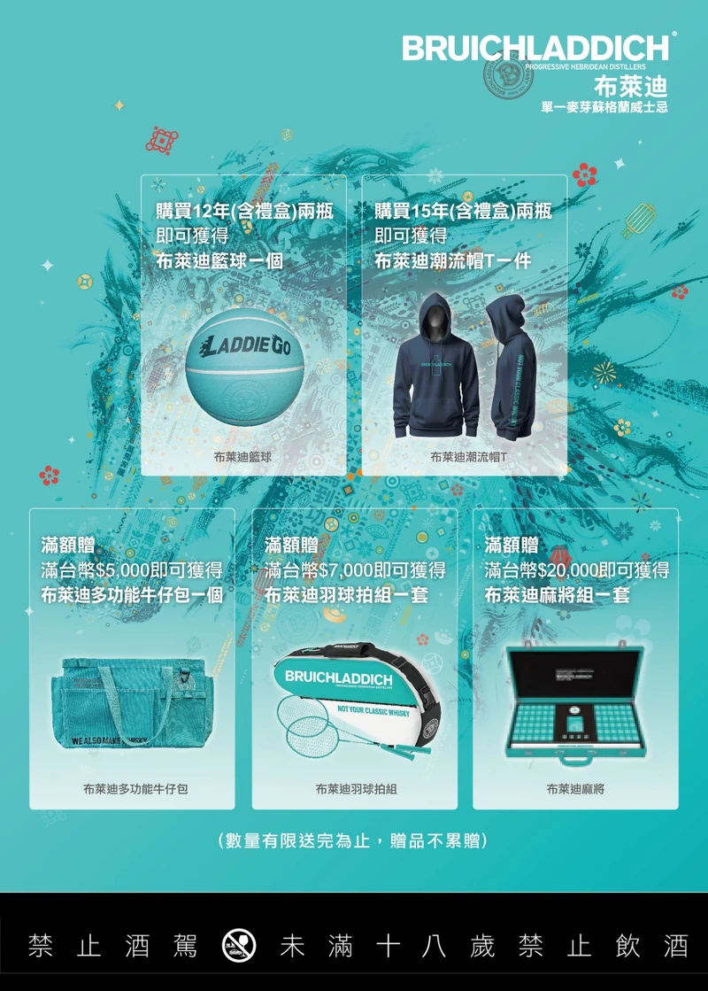 凡购买布莱迪 12 年 (含礼盒) 两瓶,即可获得布莱迪篮球一个。 凡购买布莱迪 15 年 (含礼盒) 两瓶,即可获得布莱迪潮流帽T一件。 凡购买布莱迪系列满NT5,000,即可获得布莱迪多功能牛仔包一个。 凡购买布莱迪系列满NT7,000,即可获得赠布莱迪羽球拍组一套。 凡购买布莱迪系列满NT20,000,即可获得布莱迪麻将组一套。