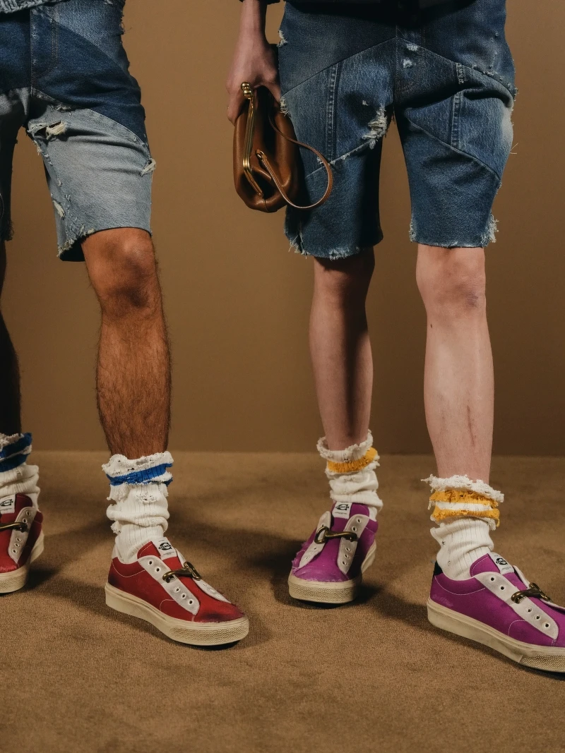 鞋履是这季最直接与年轻世代对话的单品,灵感源自1970美式街头的滑板文化,无鞋带的做旧帆布鞋身,搭配上鞋孔处的消防扣环或牵绳扣等金属细节成为亮点元素,让复古的美式街头感带着全新玩味。