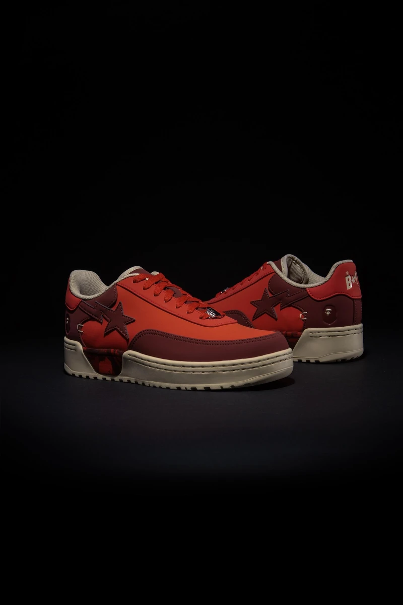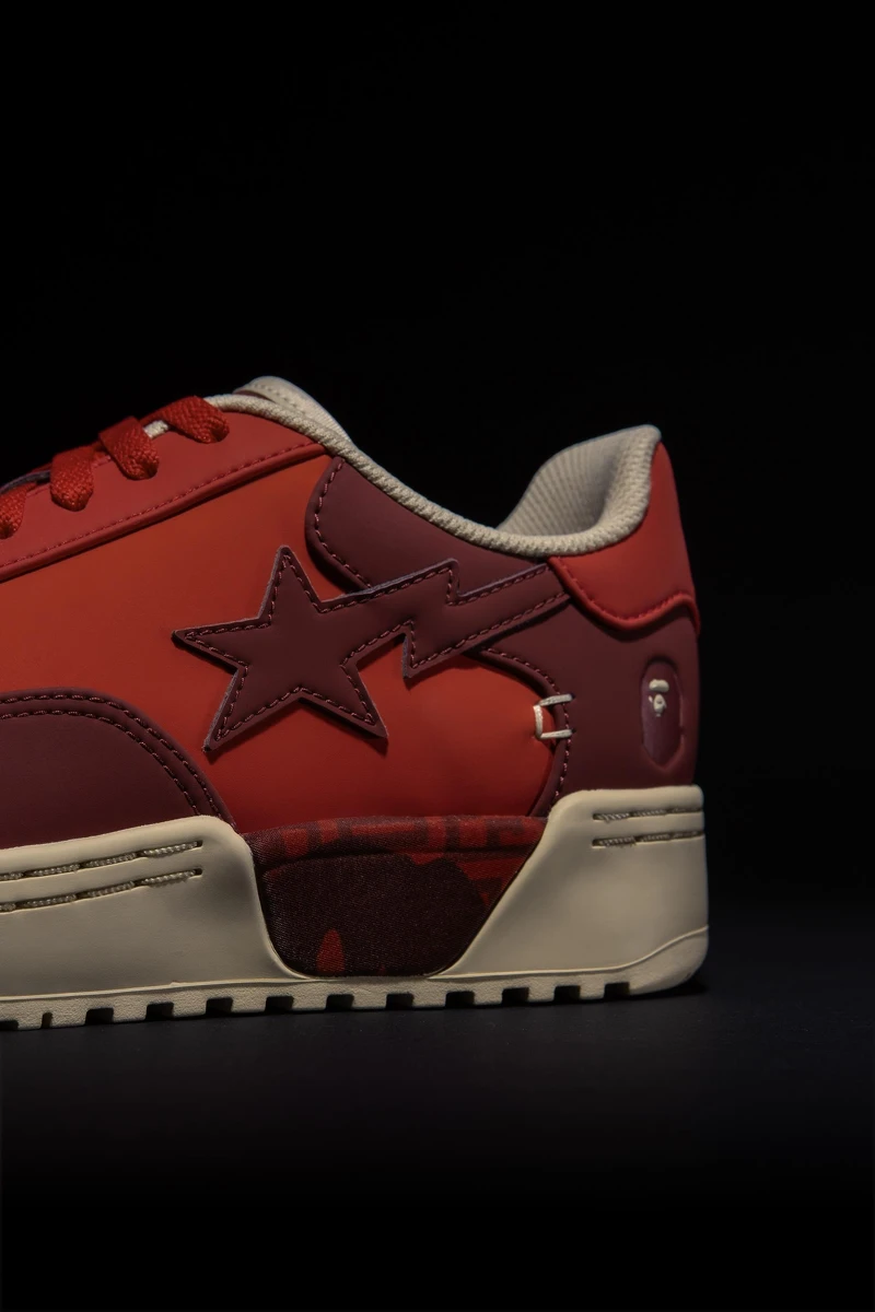 全新 BOLA STA 延续 PARABOLA 结构比例,换上 CLOT 代表性的红色皮革鞋面,以一深一浅的渐层层次呼应节庆氛围。鞋侧与鞋垫细节融入 SILK ROYALE 丝绸纹样与 BAPE® 经典 1ST CAMO 迷彩元素,完成两大品牌语彙的交会。鞋侧绣製 BAPE STA 标誌性标籤,左右后跟则透过压印工艺呈现品牌字样与 APE HEAD 图腾,强化辨识度。