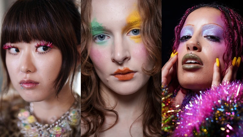 眼影不再侷限于眼窝内,而是刻意越界,延伸至眉骨或颧骨区域,边缘保留刷痕、断点与不均匀痕迹,让颜色呈现出近乎未完成的状态。Ashish、Chopova Lowena 与 Mains 的秀上,纷纷可见色彩越界,部分妆容同时使用多种色调,却不进行融合,使视线自然集中在那些未被修正的边界上,形成一种叛逆而鲜明的彩妆轮廓。