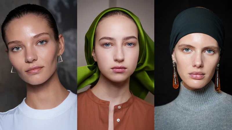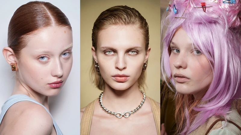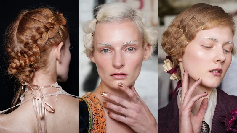 早春时尚舞台上,妆髮明确回应一种古典而内敛的审美脉络。肤色呈现乾净一致的表面,光泽运用节制,使脸部带有接近瓷器的细緻质感;眉型与眼妆几乎不作强调,视觉重心自然落在整体比例与服装线条上。在 Antonio Marras 与 N°21 的造型中,髮型多以贴头编辫、低盘髮与清楚分线构成,线条被细緻固定,缎带与珠饰仅作低调点缀;Dreaming Eli 亦以相近的造型逻辑延续这种带有贵族气息的风貌,使画面维持安静而成熟的优雅感。