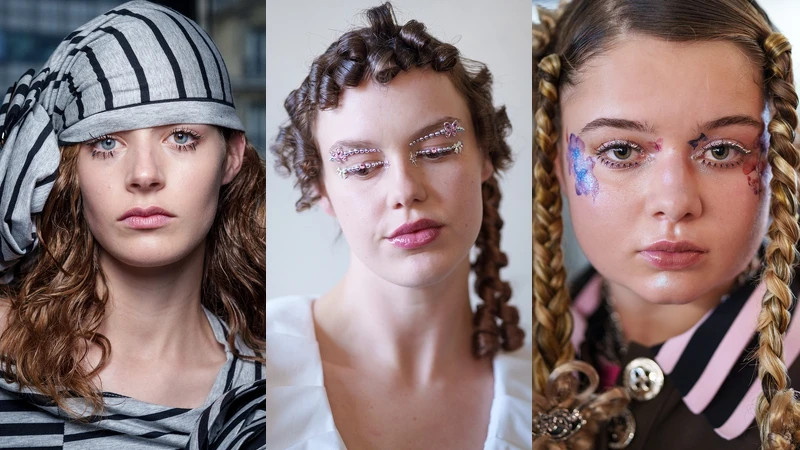 在 Chopova Lowena、Bora Aksu、Ann Demeulemeester 等秀上,妆髮的个性不再来自颜色,而是大量信手捻来、直接贴附于脸部的异材质妆点:金属饰件、贴钻、织物、羽毛、亮片与手工元素,被置于眉骨、眼周或颧骨位置,几乎不经修饰地与肌肤并存。髮型则以鬆散编辫、自然捲度或未经抛光的线条为主,看似随手完成,实则高度个人化,共同形塑出游移于浪漫与野性之间的妆髮态度。