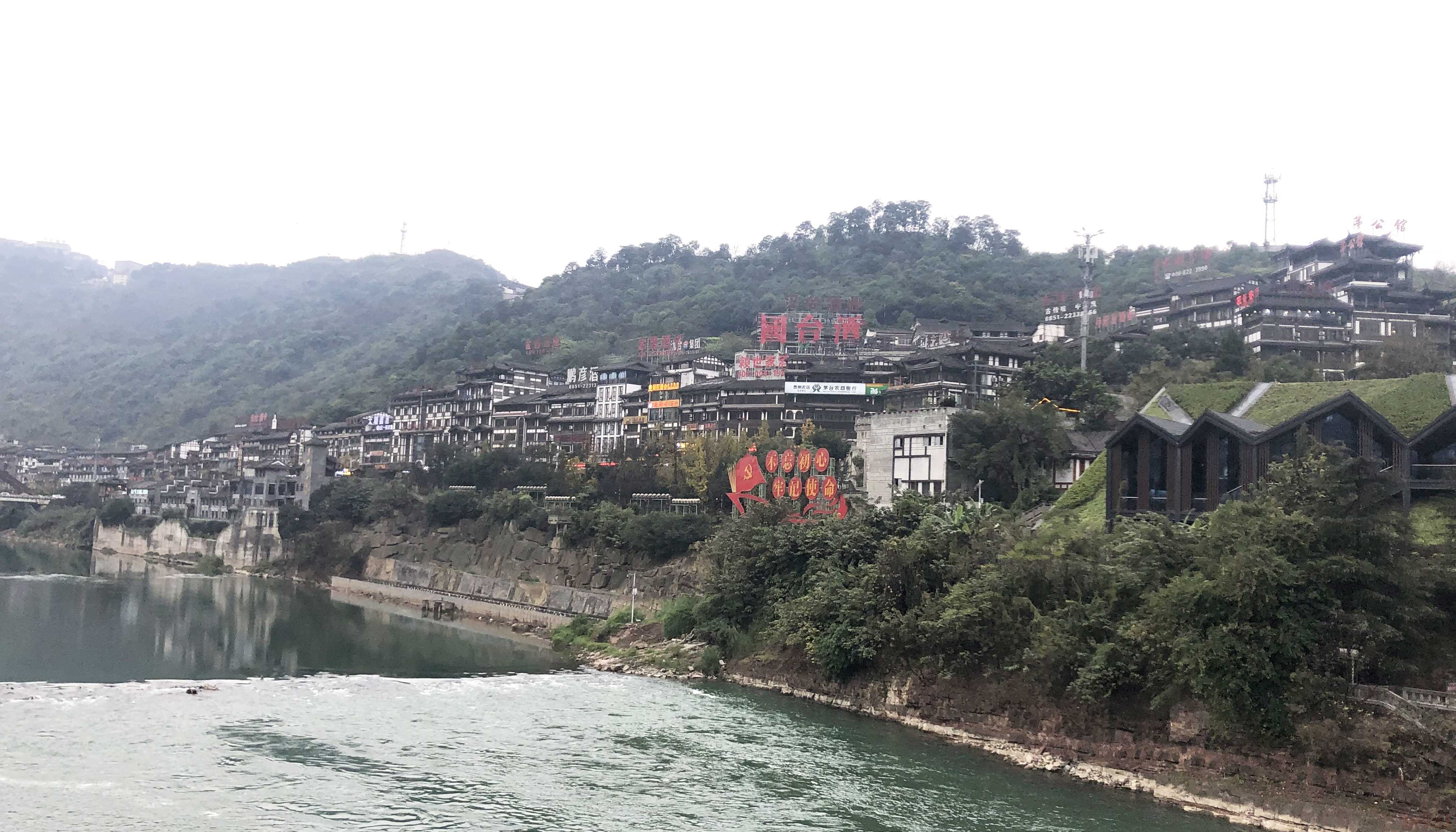 从茅台国际大酒店出发,沿着赤水河沿岸一路向西,两岸的酒厂招牌以及专卖店数不胜数。满眼望去,层层广告牌插空摆放,让你无法忘却这里就是“酱酒之都”——茅台镇。