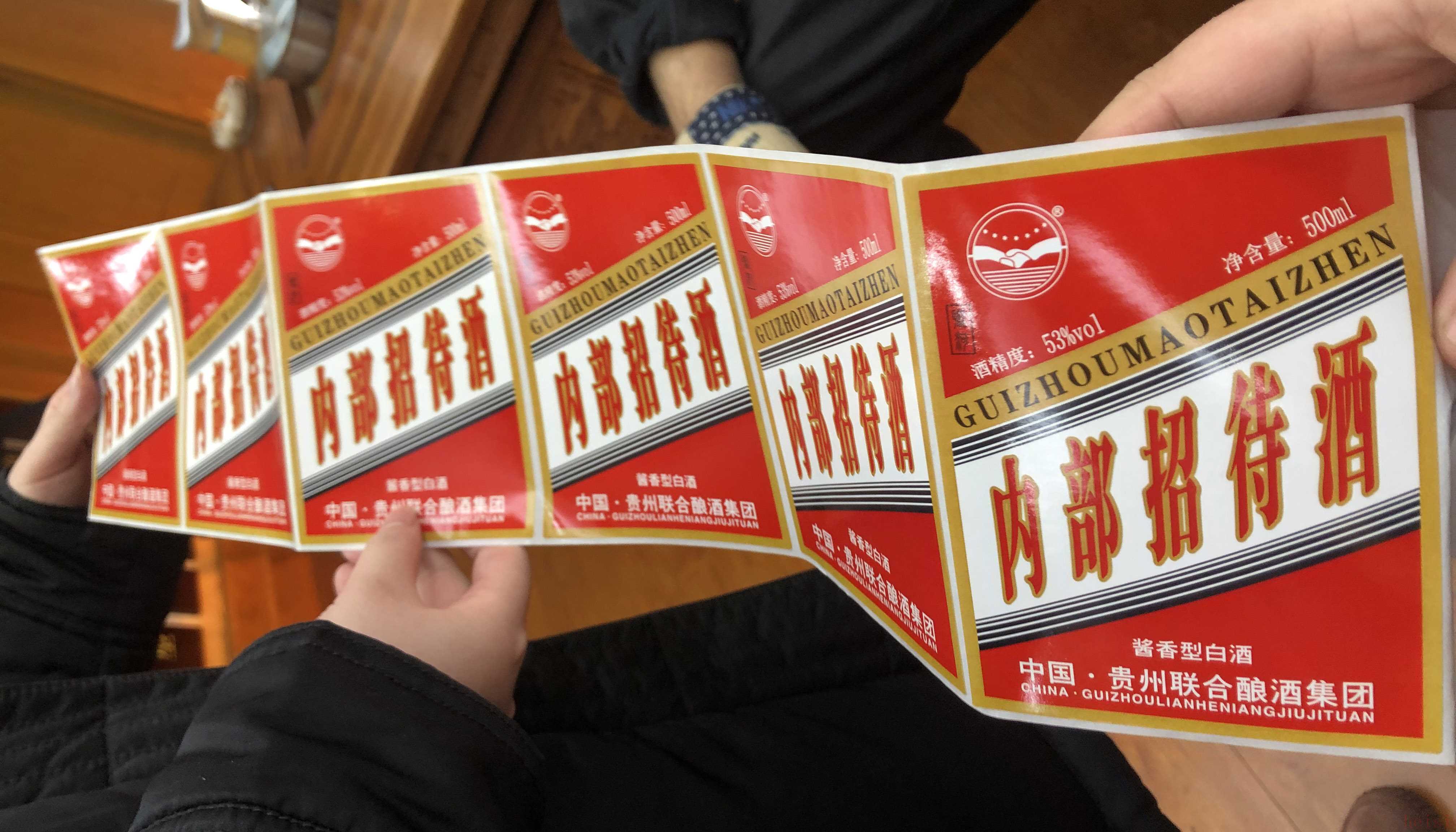 “贴牌司空见惯了,茅台镇有很多打着定制的标签做贴牌的事儿。”李伟向界面记者说道,“现在茅台镇的‘定制’服务主要是两种,一种是小酒厂灌装,包装设计都和飞天茅台较为相似;另一种,则是大酒厂通过售卖产品条码给经销商后,购买酒厂相应原酒,并由经销商销售。”李伟边说变向界面记者展示店内定制产品的商标标签。