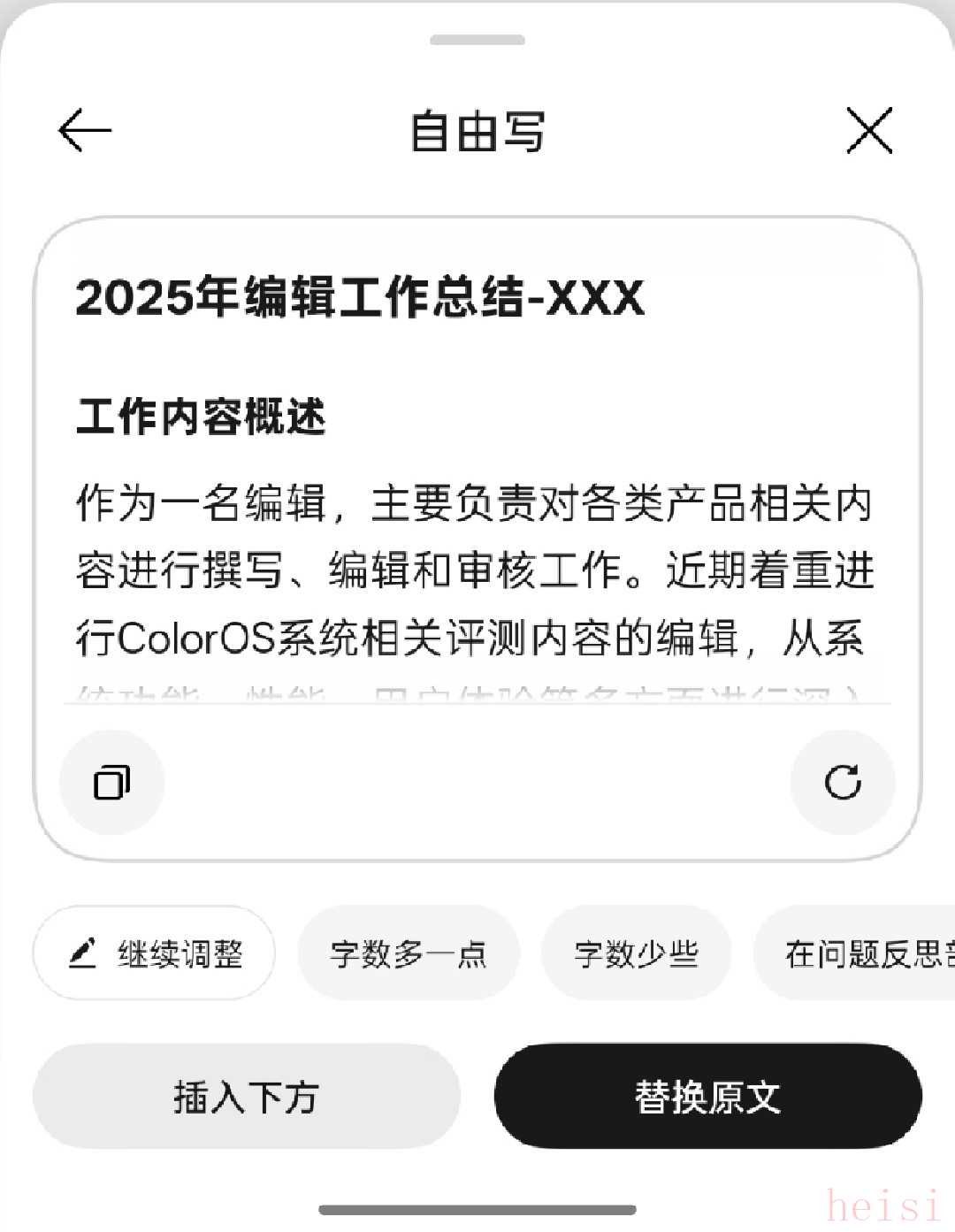 如果你不善于协作,ColorOS 16的AI写作功能,就是你身边的全能文案助手,不管是写短到一句话的点评、工作回复,还是长到几页的工作总结、演讲稿,AI都能帮你搭框架、凑内容、润语言。更省事的是,写完文字还能一键转成PPT、Excel表格或思维导图,再也不用写文2小时,排版3小时,妥妥的省时间神器。