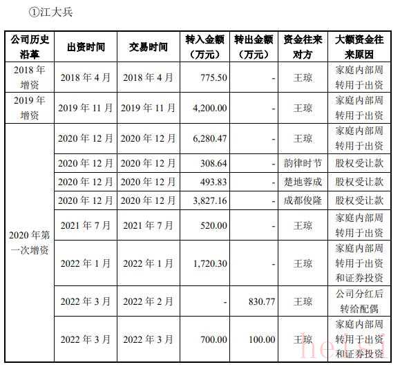 记者注意到,江大兵与其配偶王琼的大额资金往来原因,主要标注为家庭内部周转用于出资和证券投资及公司分红后转给配偶。