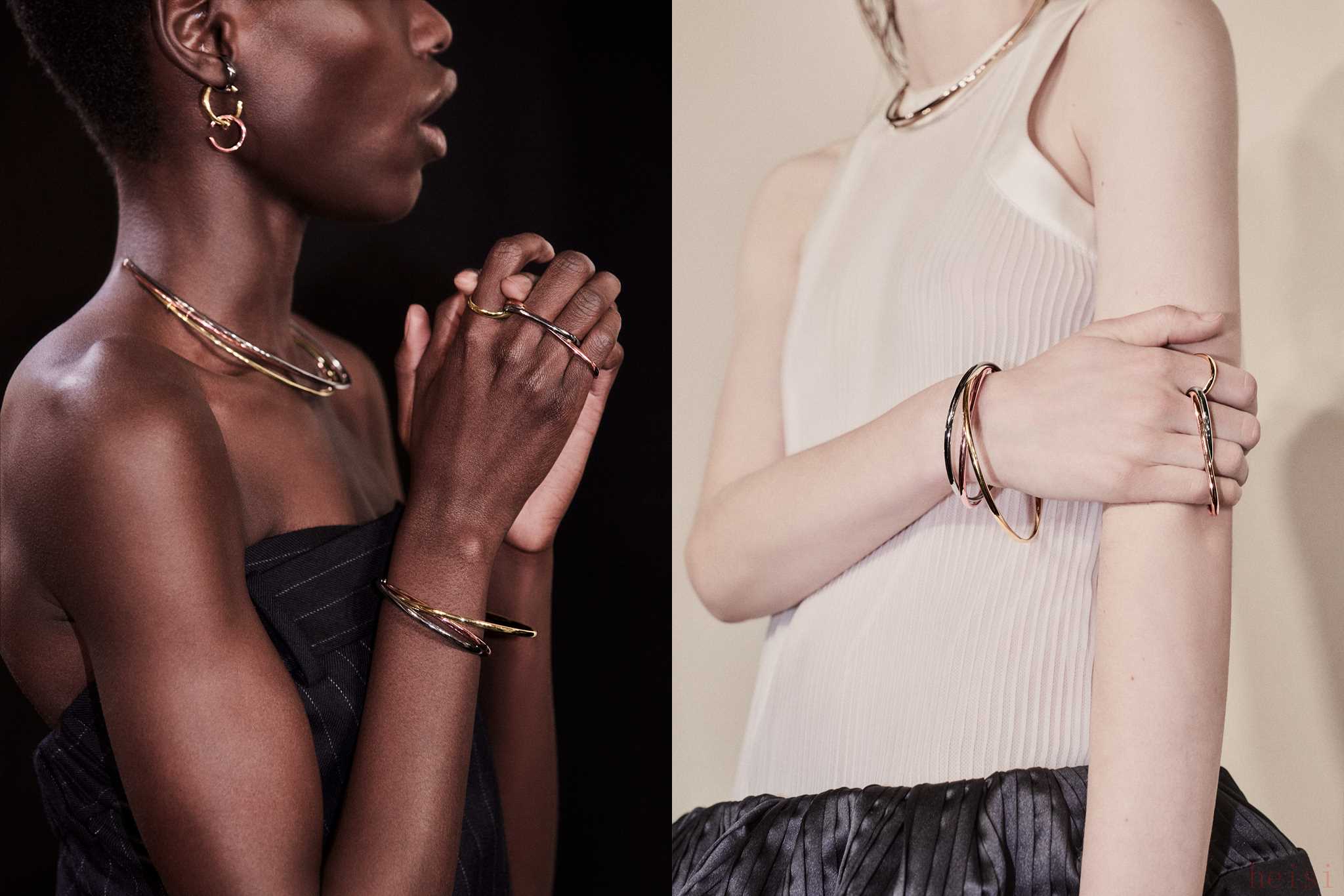 卡地亚Trinity系列珠宝中最经典的是交错缠绕的三色金戒指。阿部千登势此次在设计中对这一风格进行解构和重构,设计出了18K三色金缠绕项链、耳坠、手链,以及一套可以同时佩戴在不同手指上的三色金戒指等等。