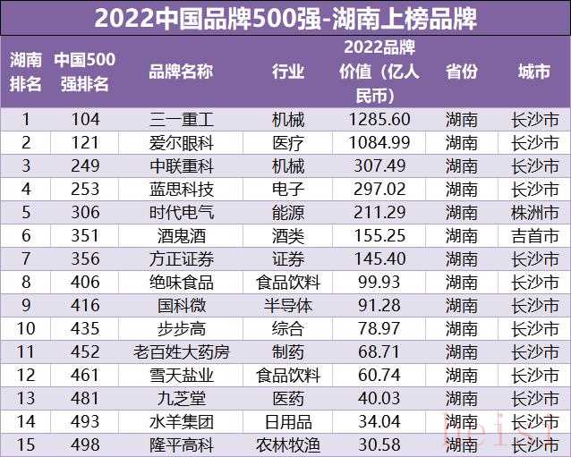 上榜《2022中国品牌500强》的15个湖南品牌分别是:三一重工、爱尔眼科、中联重科、蓝思科技、时代电气、酒鬼酒、方正证券、绝味食品、国科微、步步高、老百姓大药房、雪天盐业、九芝堂、水羊集团、隆平高科。