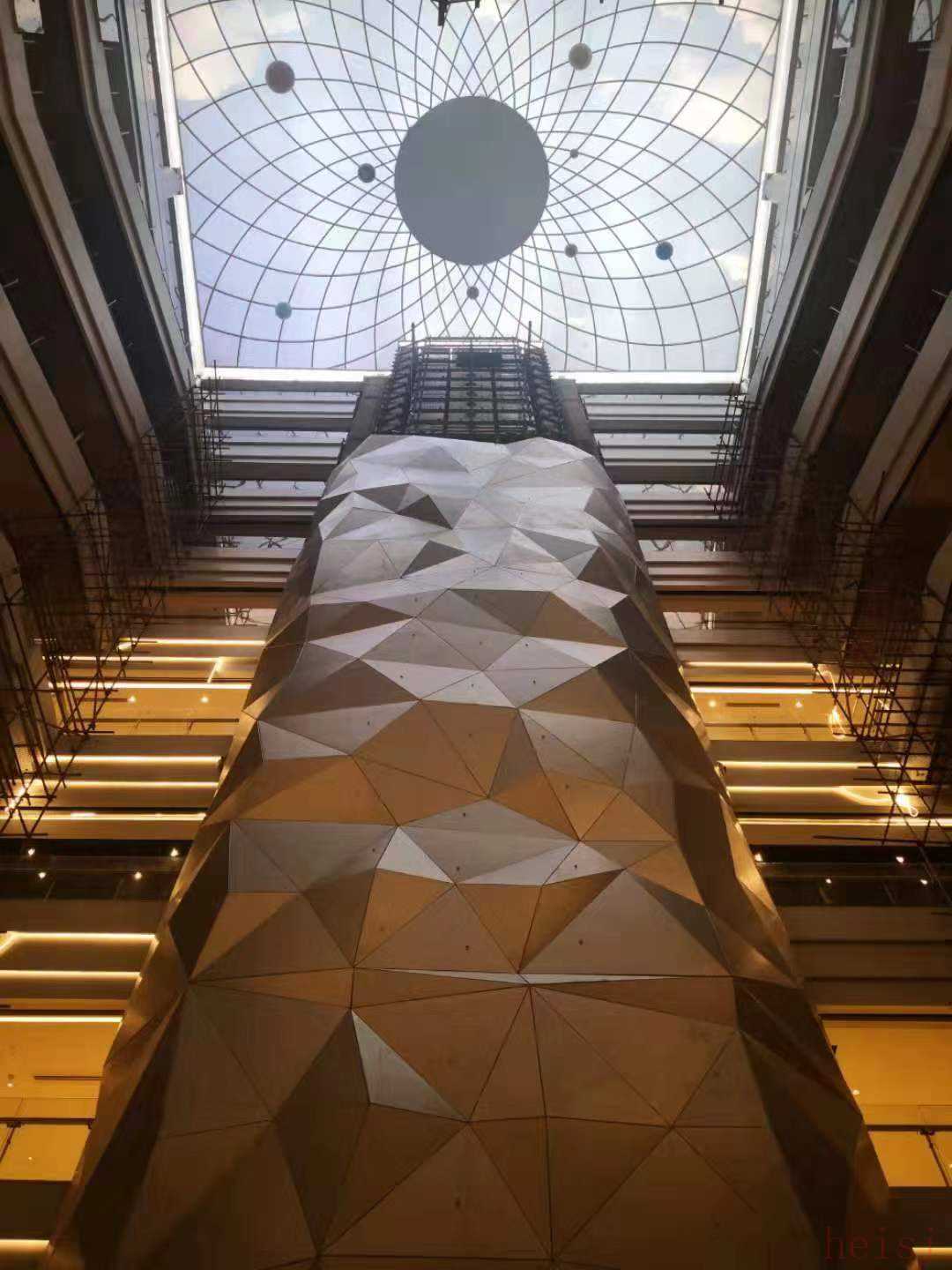 此次大调整紧扣“自然·生活”的设计主题,外立面采用了美国ART-DECO的建筑艺术装饰风格,幕墙玻璃用金色线条勾勒出“商业帝国大厦”的辉煌。每当夜幕降临,顶部五个流光溢彩的巨型球体,宛如夜空中闪耀的明星,寓意“五星耀东方”,远远望去,整个商场犹如一颗夜明珠。5个主入口各具特色,南京路东门“金顶、金钟、金带、金表、金砖”加上顶部七个大小不规则排列的吊灯,尽显华丽典雅气质;南京路正门,顶部彩云灯饰与人民公园的园林景色交相辉映;南京路西门采用了美国设计师大门厅的理念,以参天大树为背景,显得更加敞亮和自然;北门为凤阳路旋转门,进门的吊灯和正对的智能光感水幕,更好的诠释了北临苏州河,水的主题;东北旋转门,顶部的四个艺术吊灯和东门如出一辙。南中庭顶部设计,以太阳为中心与周围八颗行星,形成大自然的太阳系概念,与侧边的攀岩形成人与自然的和谐;北中庭的顶部以月亮为主题,众星拱月,与南中庭太阳形成日月同辉,天地共存的理念。