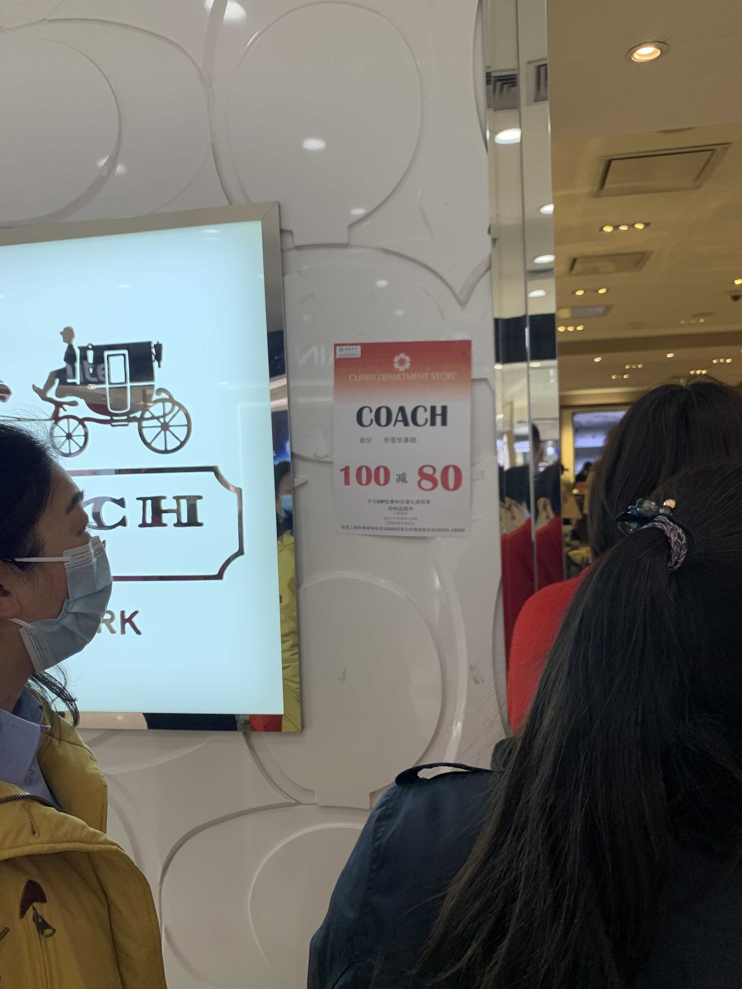 不过,部分顾客还是将这条消息看作翠微百货A座谢幕的预告,在工作日上午腾出时间前往商场购物。开在一楼的Coach门店是最热闹的地方,满100减80的折扣活动吸引了不少消费者,店内收银台前和店外走道边均拍起长队。