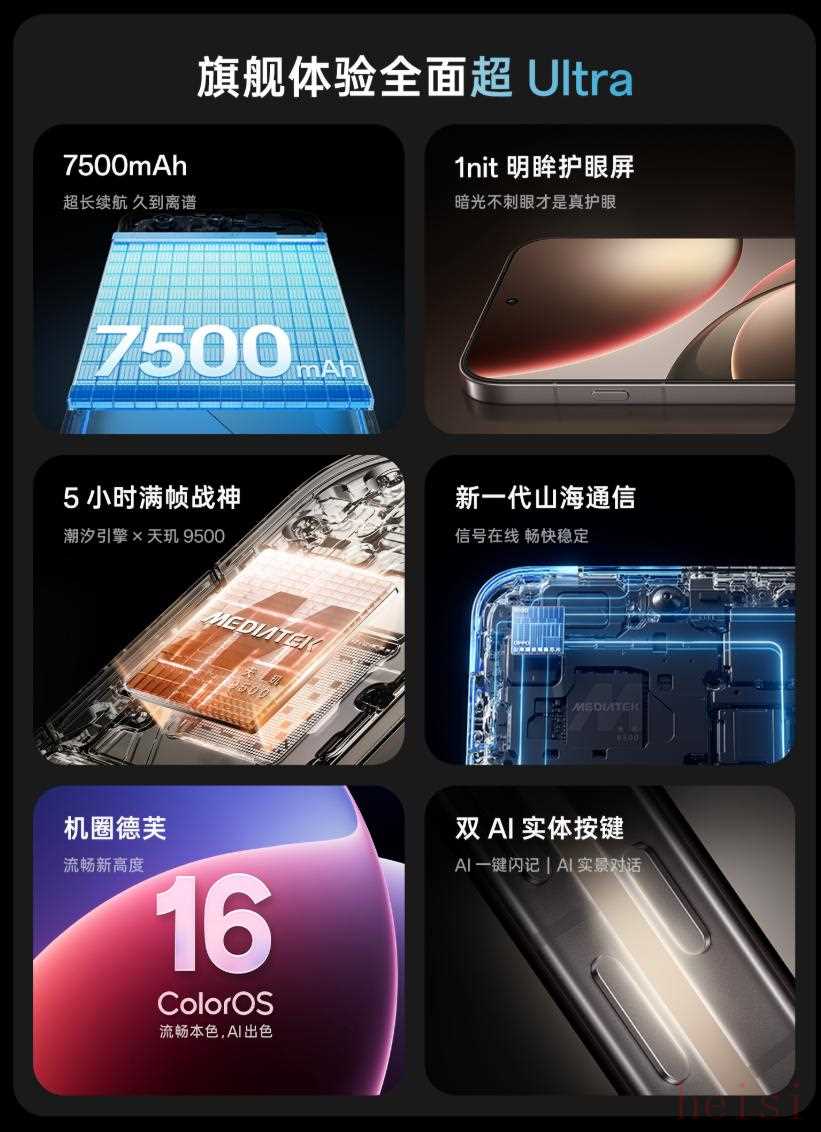 其余核心配置方面,OPPO Find X9 标准版搭载联发科新一代旗舰芯片天玑 9500 处理器,性能有所保证。正面为一块 6.59 英寸、2760×1256 分辨率、1-120Hz 自适应刷新率、1nit 明眸护眼屏,支持 3600nit 超高亮度配合太阳显示技术,全链路原彩 ProXDR 和杜比视界,并覆盖晶盾玻璃。电池方面搭载 7025mAh 大容量冰川电池,支持 80W 有线 +50W 无线充能。除此之外,超声波指纹识别、自研山海通信增强芯片、IP66/68/69 满级防尘防水、多功能 NFC、X 轴线性马达、超线性双扬声器、红外、ColorOS 16 系统等也一并支持或搭载。