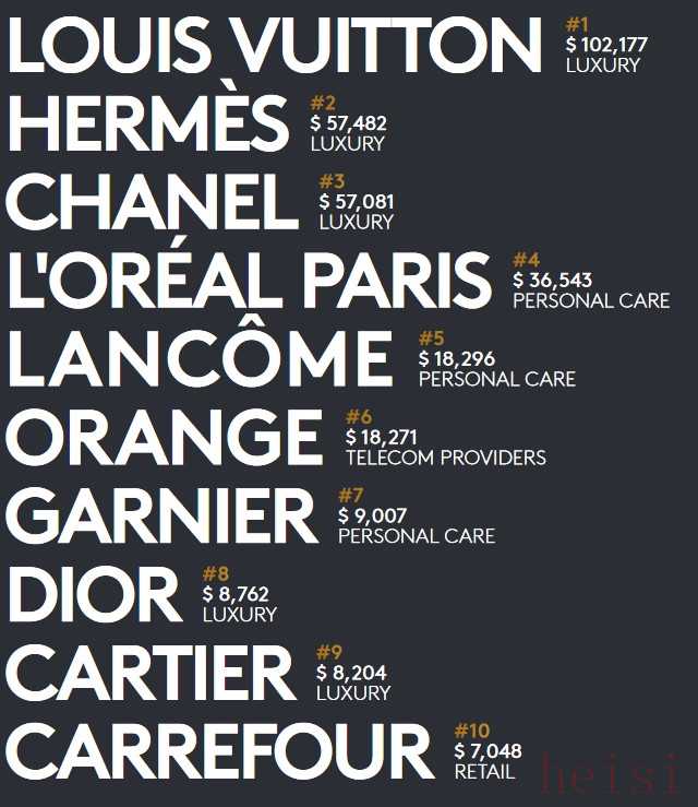 美妆个护品牌有三席,剩下的两席是电讯Orange和零售Carrefour。