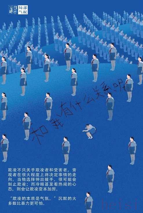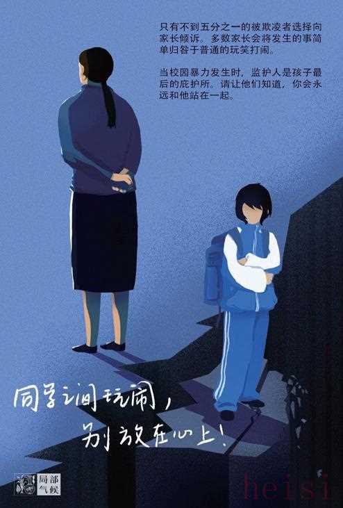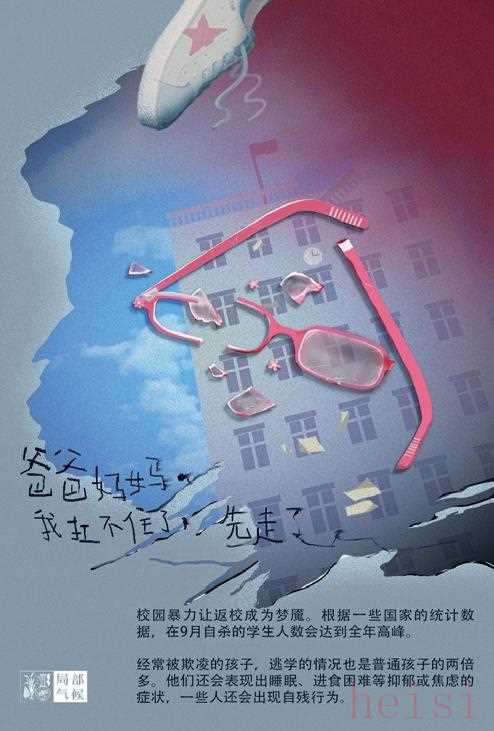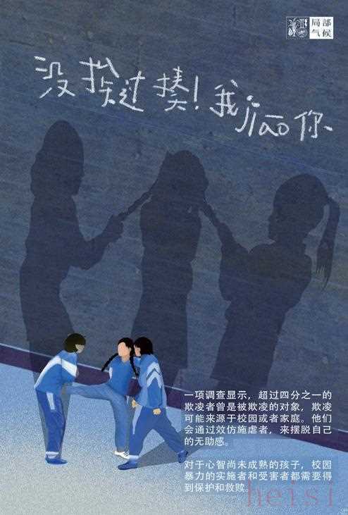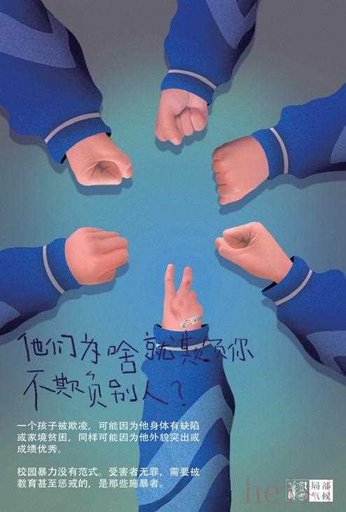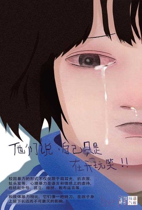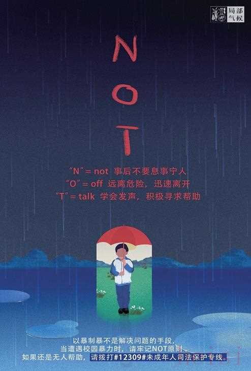 广告语:他们为啥就欺负你,不欺负别人?/同学之间玩闹,别放在心上!/他们说,自己只是在开玩笑!!/和我有什么关系呢/爸爸妈妈,我扛不住了,先走了/没挨过揍!我jiāo你/他们说,学校是我第二个家/她只是个孩子啊!/NOT,“N”=not,事后不要息事宁人。“O”=off,远离危险,迅速离开。“T”=talk,学会发声,积极寻求帮助。