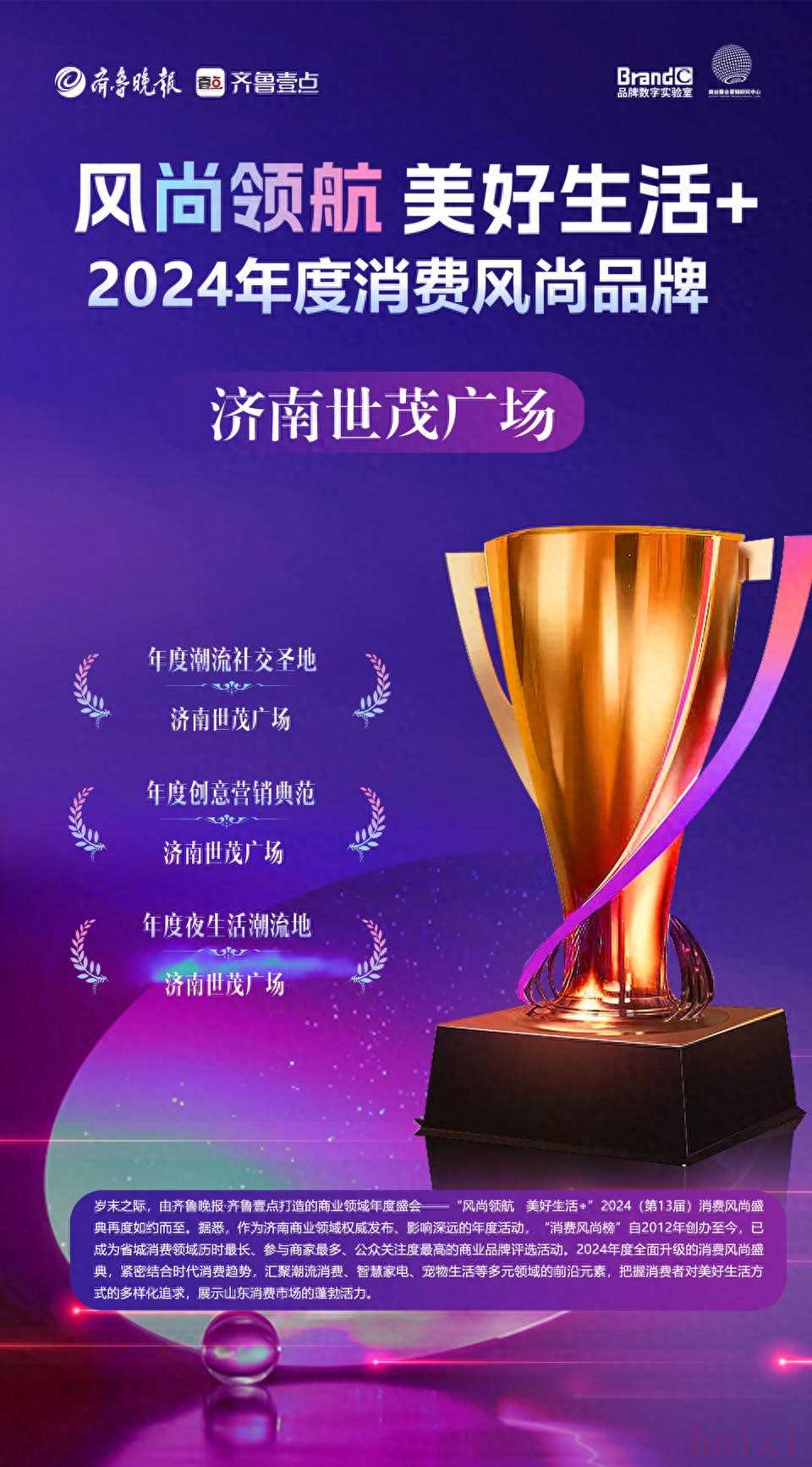 恭喜济南世茂广场获得“2024年度消费风尚品牌”这一荣誉!这是一个很高的评价,意味着他们在品牌影响力、服务品质、消费体验以及引领市场潮流等方面都表现突出,深受消费者的喜爱和认可。
