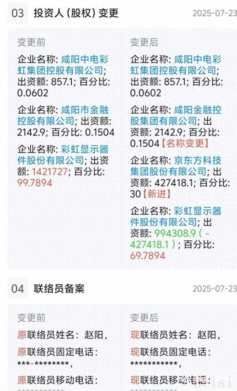 7月30日,南都湾财社记者从天眼查APP获悉,近日咸阳彩虹光电科技有限公司(以下简称彩虹光电)发生工商变更,新增京东方为股东,同时多位高管发生变更。