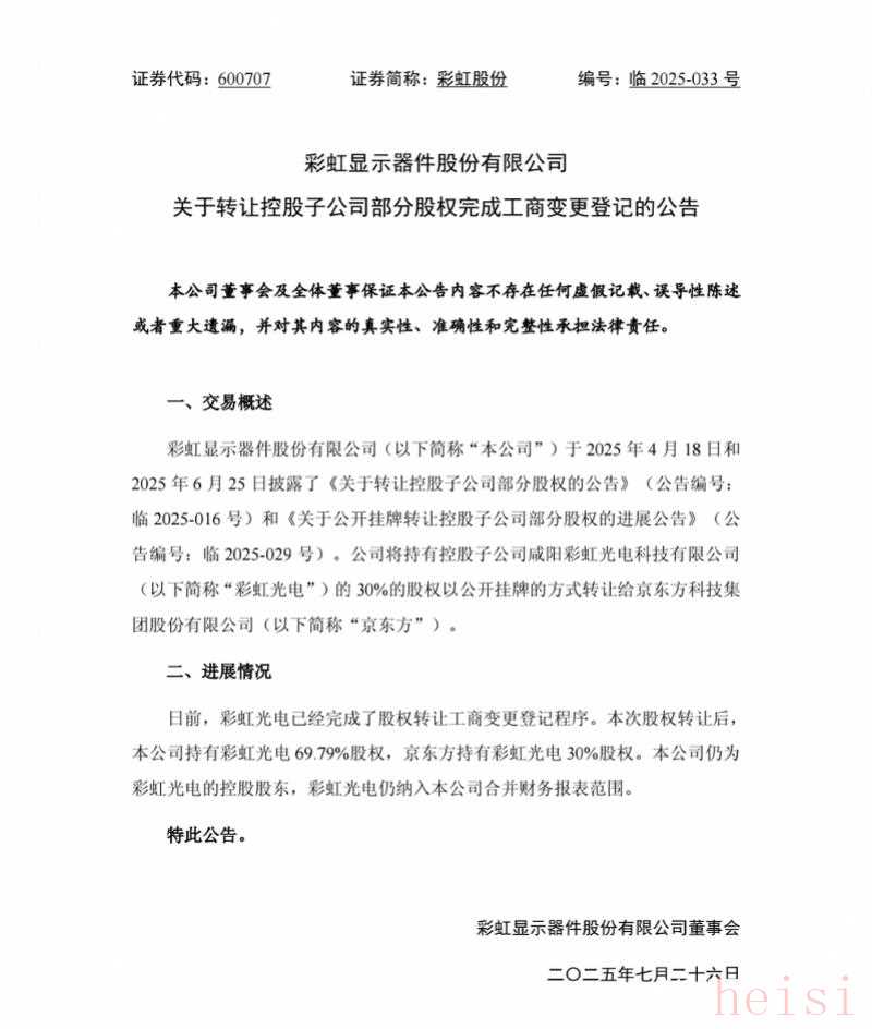 公告内容指出,日前彩虹光电已经完成了股权转让工商变更登记程序。本次股权转让后,本公司持有彩虹光电 69.79%股权,京东方持有彩虹光电30%股权位列第二大股东。本公司仍为彩虹光电的控股股东,彩虹光电仍纳入本公司合并财务报表范围。