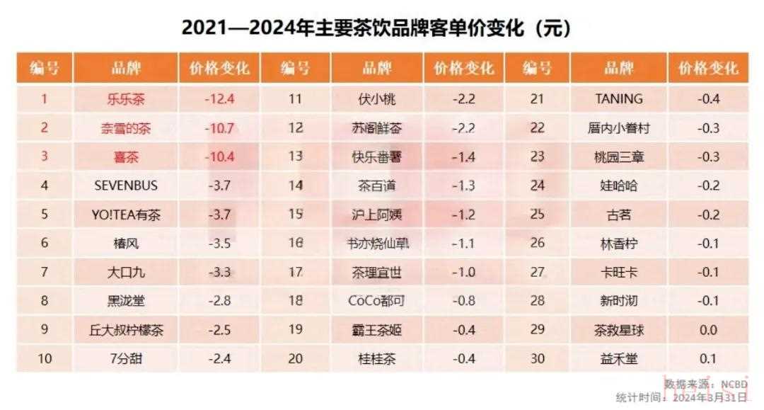 新式茶饮市场这几年的确在价格方面陷入了胶着状态,据餐宝典的数据统计,2021年至今2024年期间,包括奈雪的茶、喜茶客单价下调幅度均大于10元。