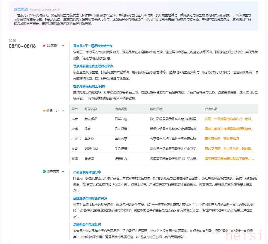 - 品牌活动与明星合作关注 抖音对品牌活动中的明星造型、现场氛围等关注度高,如“王一博在香奈儿蔚蓝之夜帅炸了”;小红书用户会讨论活动中展示的新品及体验,如“香奈儿蔚蓝珍藏香精的味道很特别”;微博则聚焦于明星与品牌合作的动态及背后故事,像“萧亚轩和香奈儿的合作舞台好有看点”。