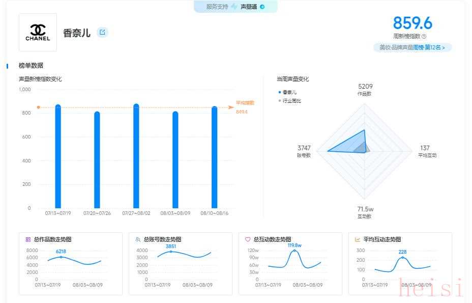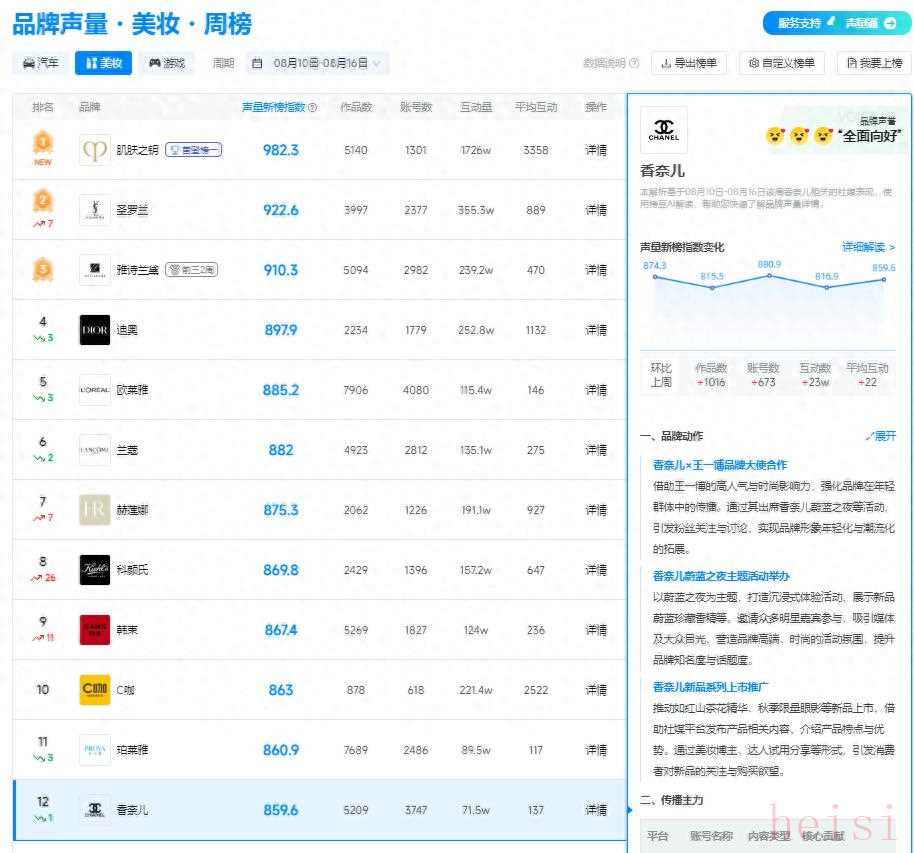 香奈儿在上周的美妆品牌榜中位于第12位,随着新品上线,品牌声量呈现上升趋势,看看他们上周的宣发动作都有哪些亮点: