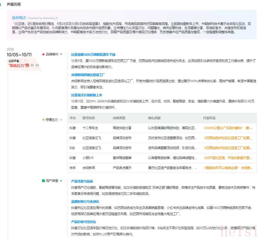- 品牌影响力与全球化 抖音热议比亚迪在海外的发展,如巴西总统成为车主及英国销量激增;小红书关注品牌全球化成果,如第1400万辆新能源车巴西下线;视频号探讨品牌在海外受欢迎程度及布局,如巴西市场表现与全球最大电池工厂。