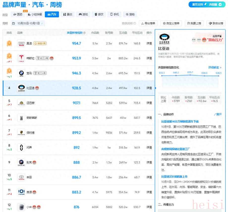 新榜品牌声量・汽车周榜(10 月 05 日 - 10 月 11 日)发布,比亚迪以 928.5 的声量新榜指数位居第四 。