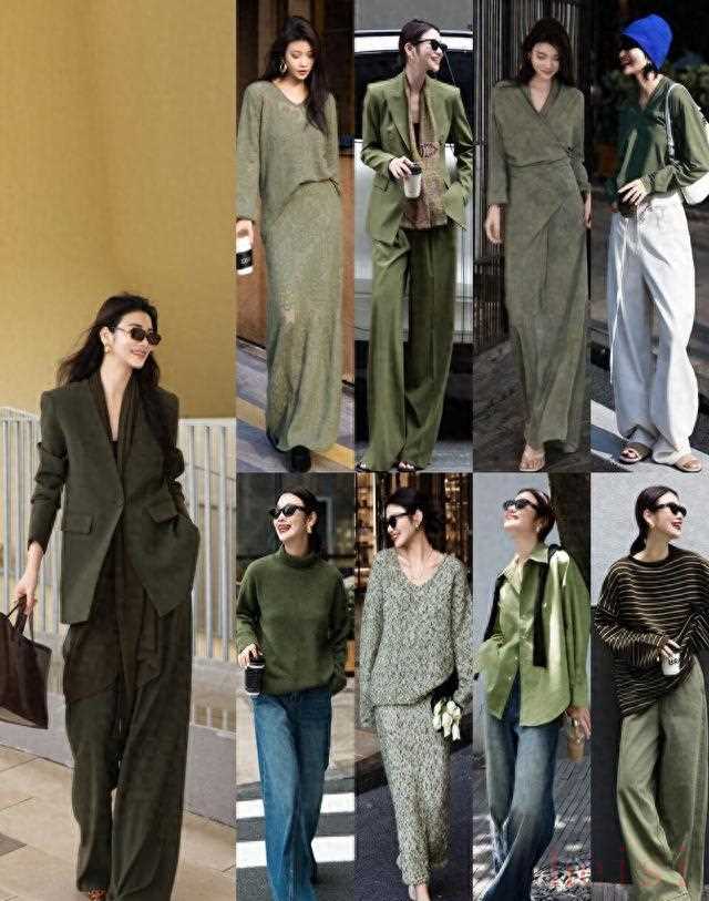 "驼色系":驼色是非常经典的中性色,温暖、包容,给人一种慵懒又舒适的感觉。无论是驼色毛衣、内搭还是配饰,都能很好地衬托出深橄榄绿的沉稳,让整体造型看起来更和谐、更有层次感。