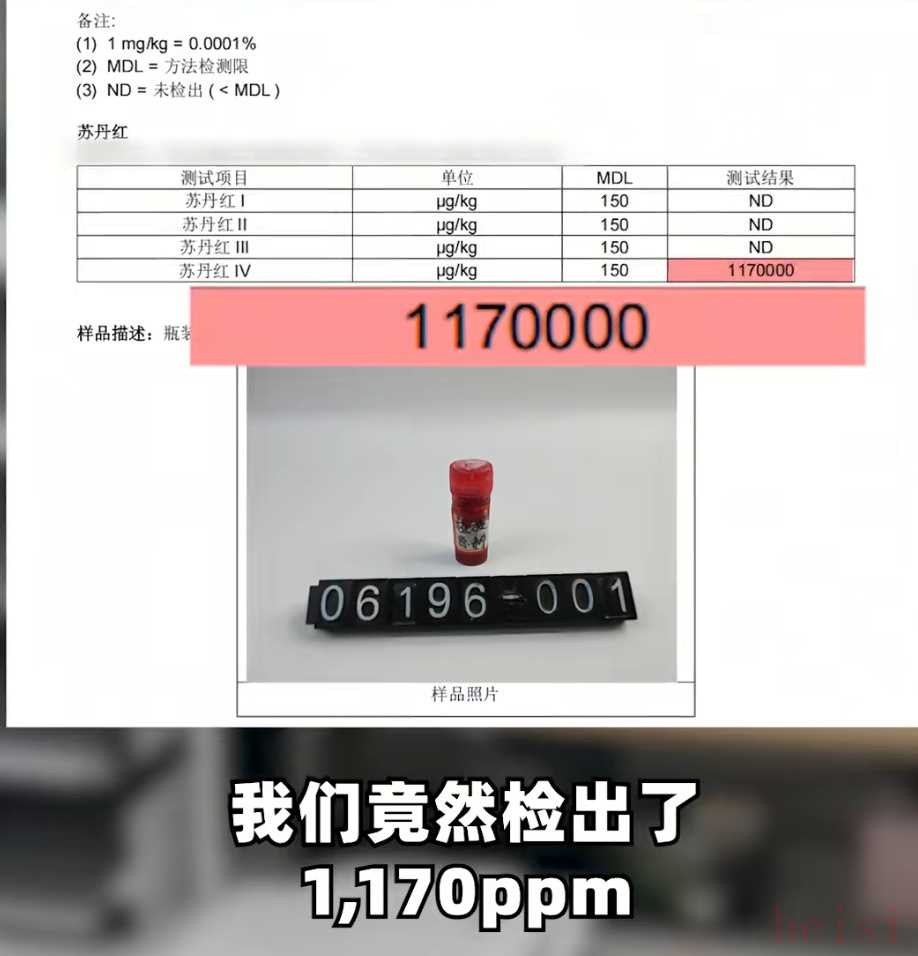 “老爸测评”将疑似原料送检,他们展示的检测报告显示,苏丹红IV高达1170000ppm,添加了该原料的化妆品检测结果为全部检出含有苏丹红。