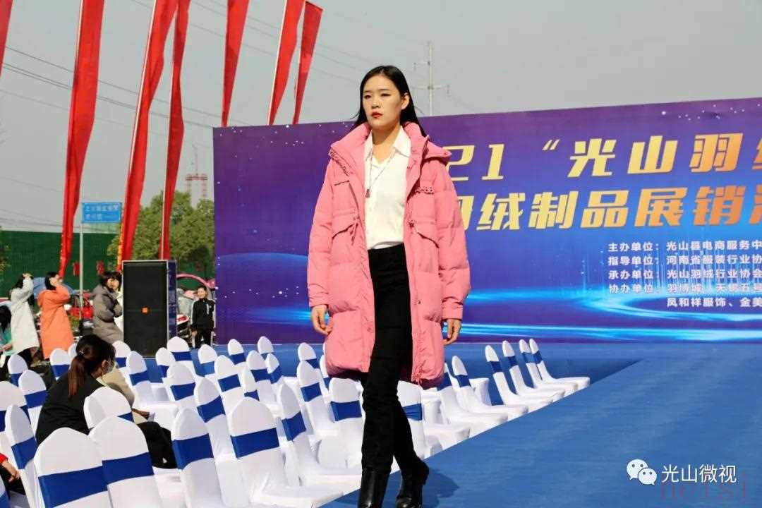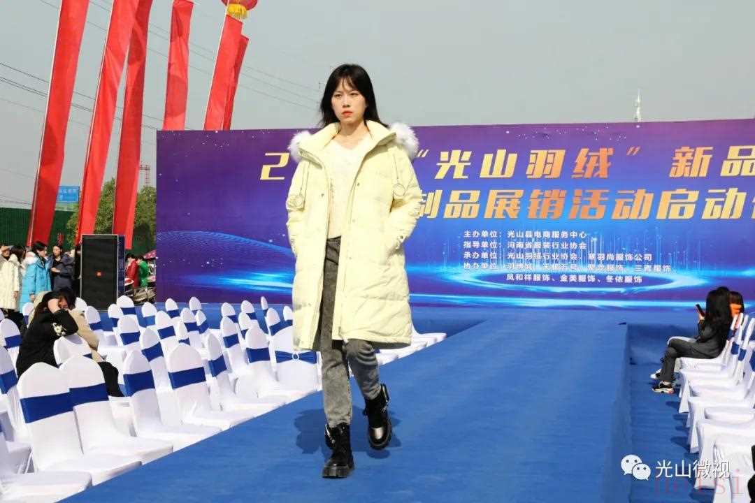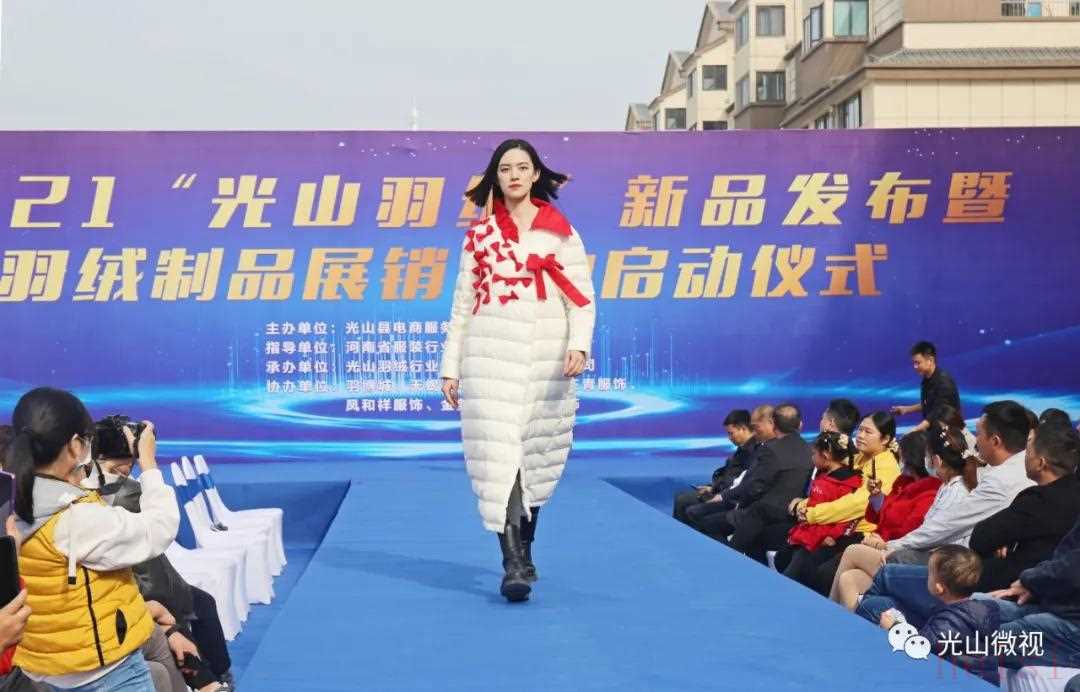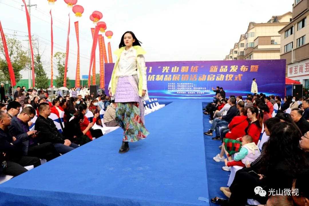 10月25日上午,由光山县电商服务中心主办,光山县羽绒服装行业协会、光山县寒羽尚服饰有限公司承办的2021“光山羽绒”新品发布暨羽绒制品展销活动启动仪式在县羽博城寒羽尚羽绒服工厂销售体验馆旁举行。活动现场展示了由县政府与苏州天蝎五号服装设计有限公司合作研发的今冬羽绒服装新品100款,并通过“新品T台秀+网红直播+展示展销”的方式,线上线下同步销售,正式拉开了光山县2021年羽绒制品销售及消费扶贫的序幕。