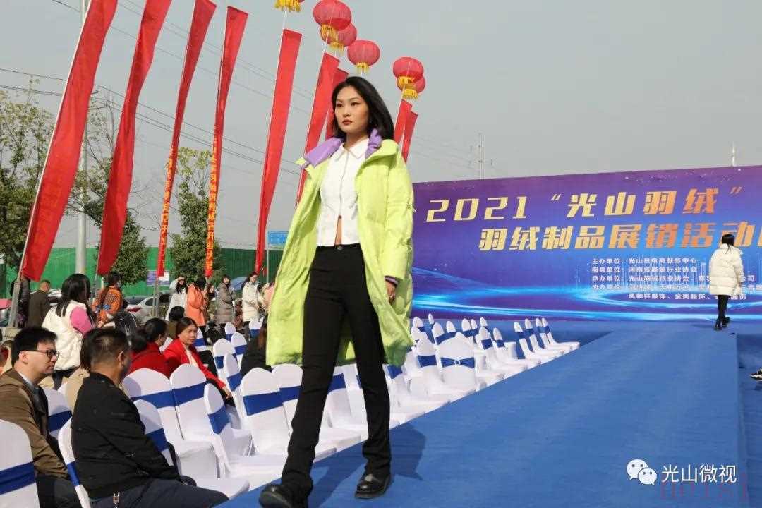 光山县电商服务中心主任王全良说:“光山羽绒新品发布与展示,是县政府与苏州天蝎五号服装设计有限公司合作研发的成果,深受全县羽绒服装企业及广大消费者的赞许。今冬羽绒制品展销,凝聚着以寒羽尚公司及其法人陈锋同志为代表的光山羽绒人矢志不移、执着艰辛的勤劳汗水。本次活动在豫南羽绒特色小镇羽博城举办,是推动我县羽绒行业划行规市及实现高质量发展的有力举措,光山羽绒产业发展未来可期!”在新品发布T台秀展示环节,气场强大的模特们身穿2021“光山羽绒”新品,以时尚视角诠释各类新品羽绒服装之美,吸引了众多羽绒企业业主、羽绒服加工户和观众的关注。