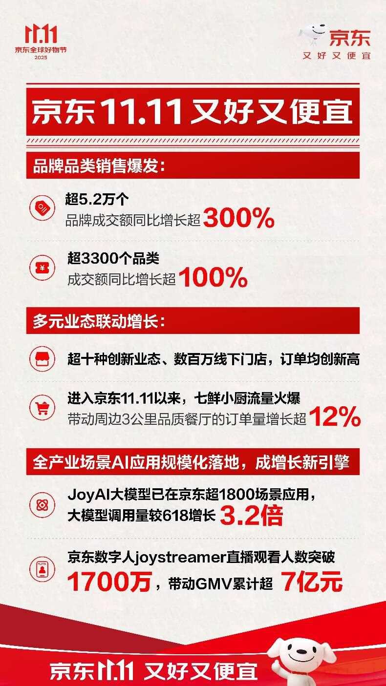 这个京东 11.11,AI 技术全面渗透经营各环节,助力品牌和商家降本提效。京东云携 JoyAI 系列产品服务超 300 万商家;JoyAI大模型已在京东超1800场景应用,大模型调用量(token)较618增长了3.2倍;JoyBuilder模型开发平台,调用量较去年同期增长超6倍;京东数字人JoyStreamer服务品牌超35,000家,截至目前,数字人直播观看人数突破1700万,带动GMV 累计超 7 亿元。AI 重构消费体验,兼顾 “高效率 + 高情商”的京东智能客服累计咨询服务量超13亿,覆盖了售前、售中、售后、物流等全场景,用户满意度80%以上。京东金融以白条分期免息、支付补贴、供应链金融商家息费优惠、保险服务等多种形式“百亿消费补贴”助力销售增长。