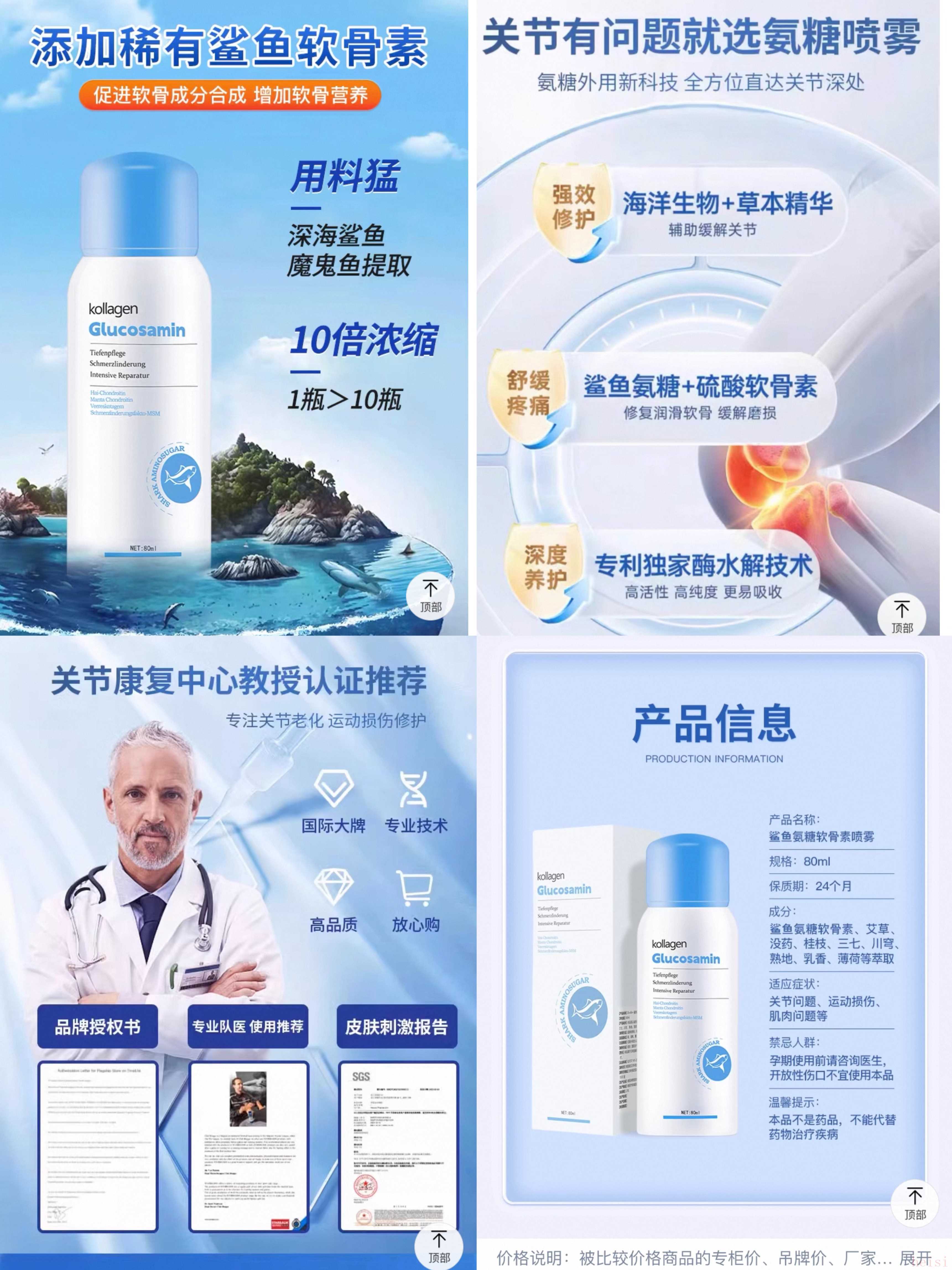 “精准氨糖喷雾,高效修护关节,革新氨糖喷雾,适用全身关节。”在上述平台的迪熙旗舰店,一款Dr.pinly鲨鱼氨糖软骨素喷雾产品的宣传页面显示,该产品“10倍高浓缩吸收,可以深度呵护软骨,深层强化修护,减少运动磨损”。并利用“关节不适,生活困扰,走不动、跑不开、上不去、起不来。年龄增长力不从心,变天受凉关节酸麻,摩擦劳损关节咔咔响,久站无力关节承重差,活动受限软骨不适。”“每天喷一喷,养护膝盖,适用于上班族(久坐膝关节不适)、运动党(长期运动膝盖磨损)、中老年(年纪增长关节易受损)”等内容,暗示产品所适用人群。该产品的宣传页面还将关节问题归因于软骨受损,并以此推荐“补充关节营养”。